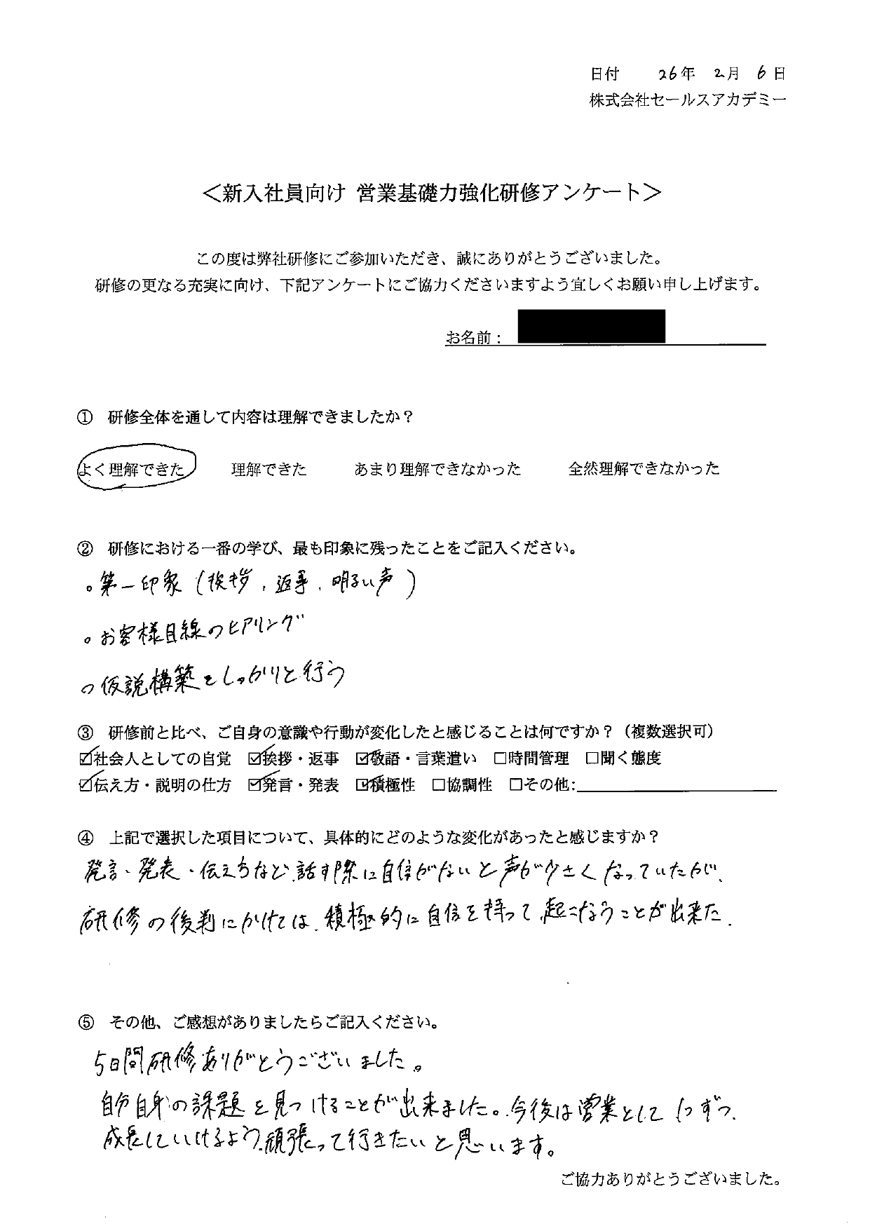 発言、発表、伝え方など、話す際に自信がないと声が小さくなっていたが、研修の後半にかけては、積極的に自信を持って行うことができた。