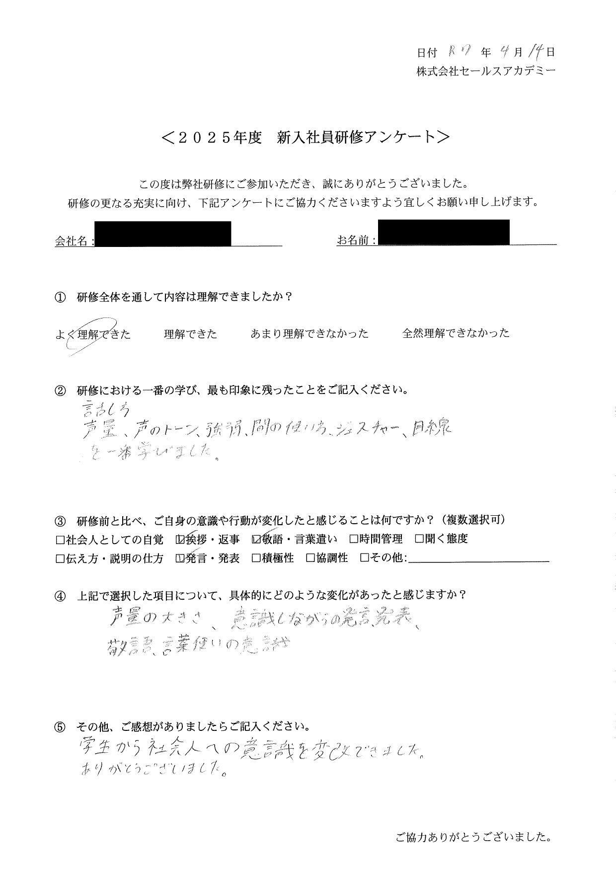 新入社員研修における一番の学び、最も印象に残ったことをご記入ください。