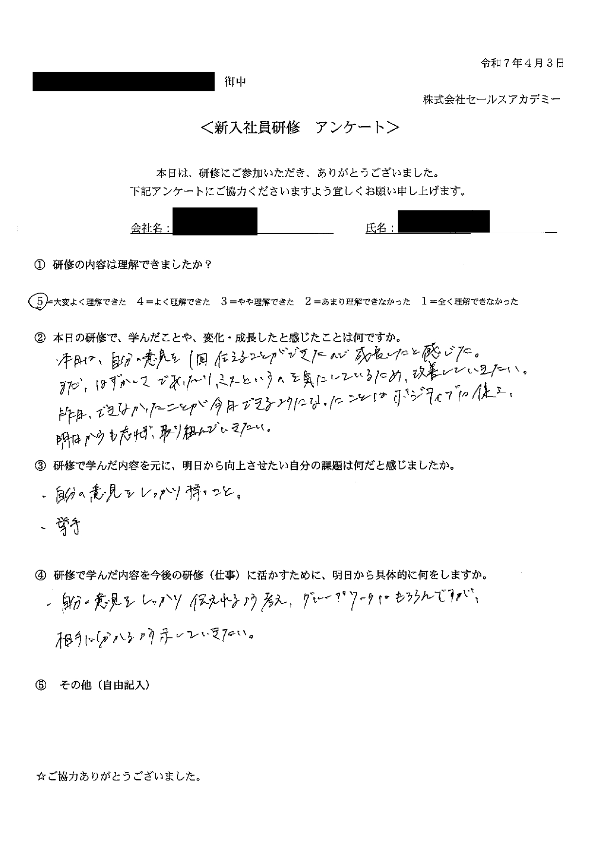 新入社員研修で学んだ内容を元に、明日から向上させたい自分の課題は何だと感じましたか。