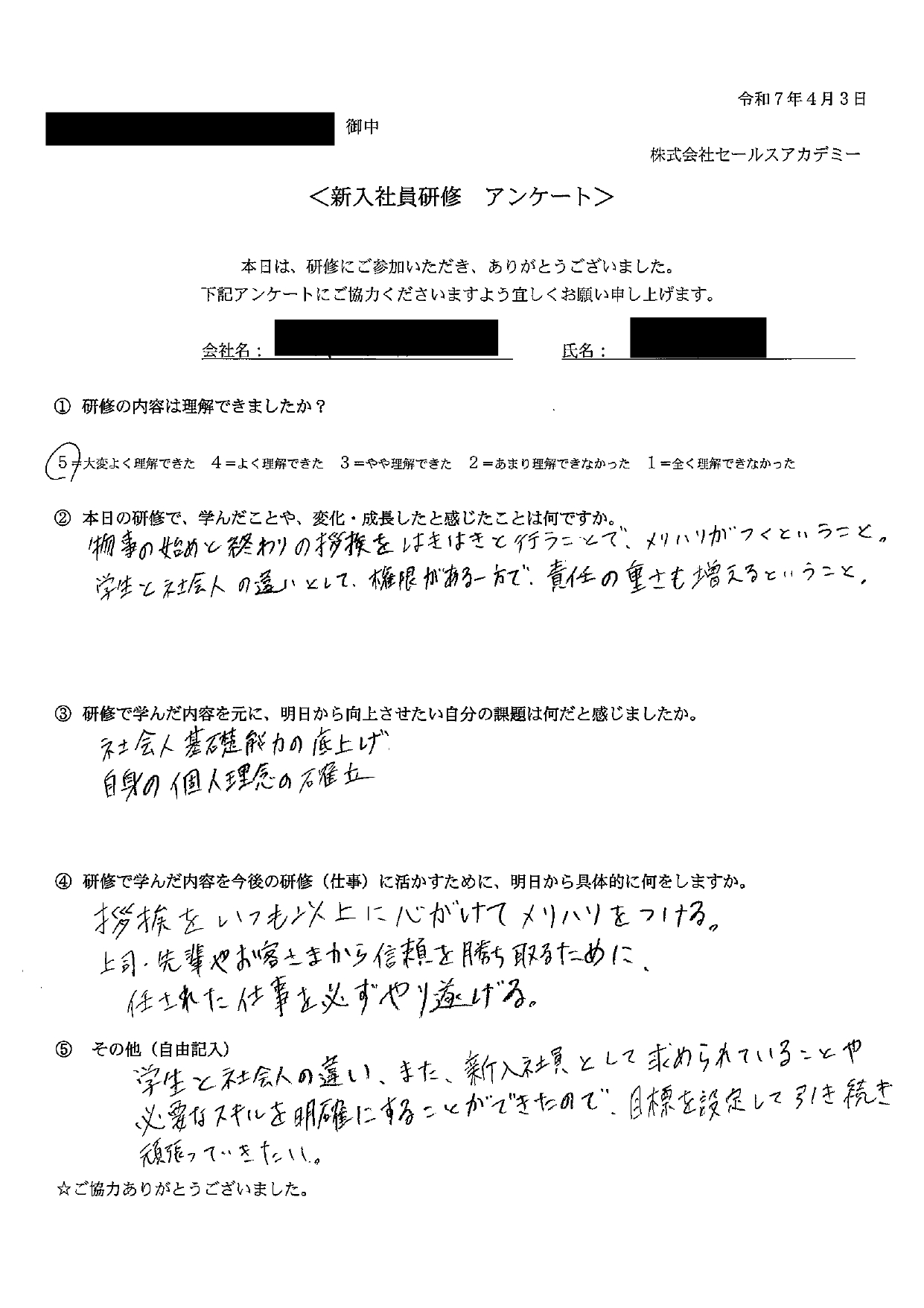 本日の新入社員研修で、学んだことや、変化・成長したと感じたことは何ですか。