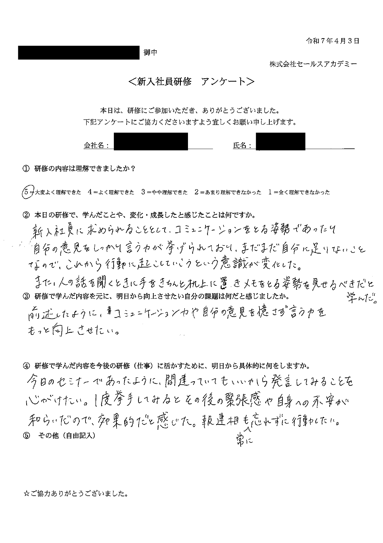 新入社員研修で学んだ内容を元に、明日から向上させたい自分の課題は何だと感じましたか。
