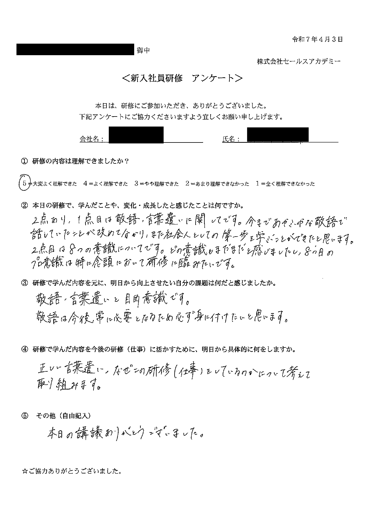新入社員研修で学んだ内容を元に、明日から向上させたい自分の課題は何だと感じましたか。