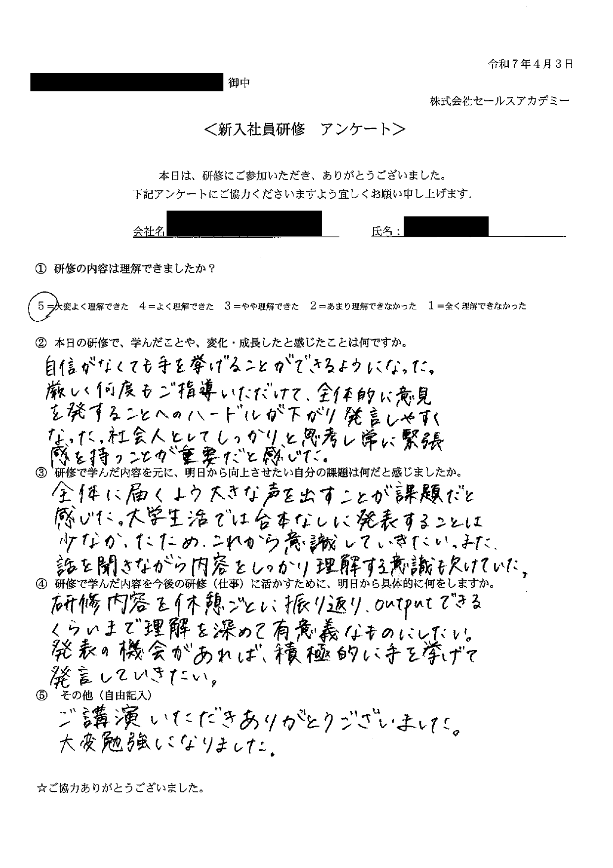 新入社員研修で学んだ内容を元に、明日から向上させたい自分の課題は何だと感じましたか。