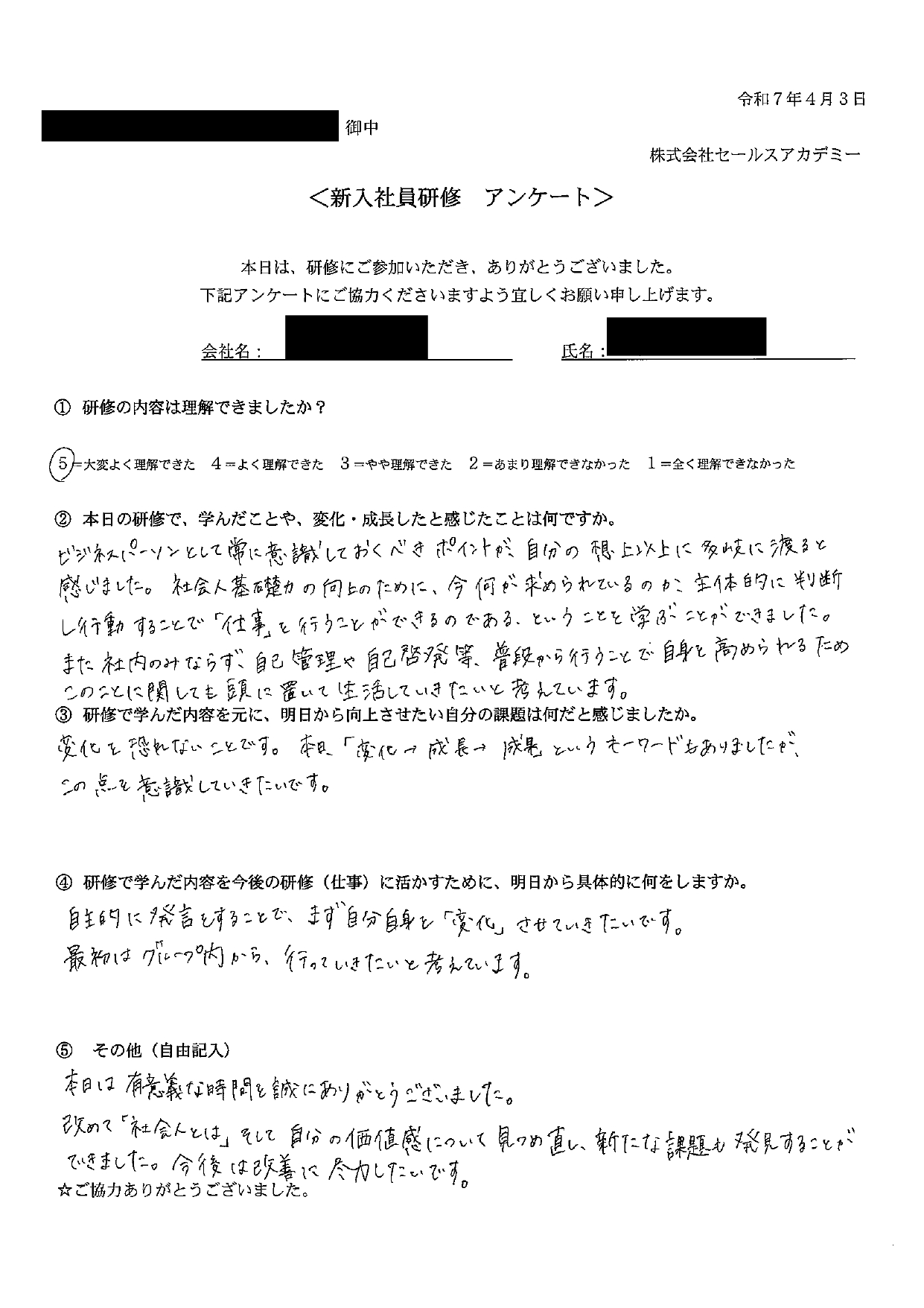 本日の新入社員研修で、学んだことや、変化・成長したと感じたことは何ですか。