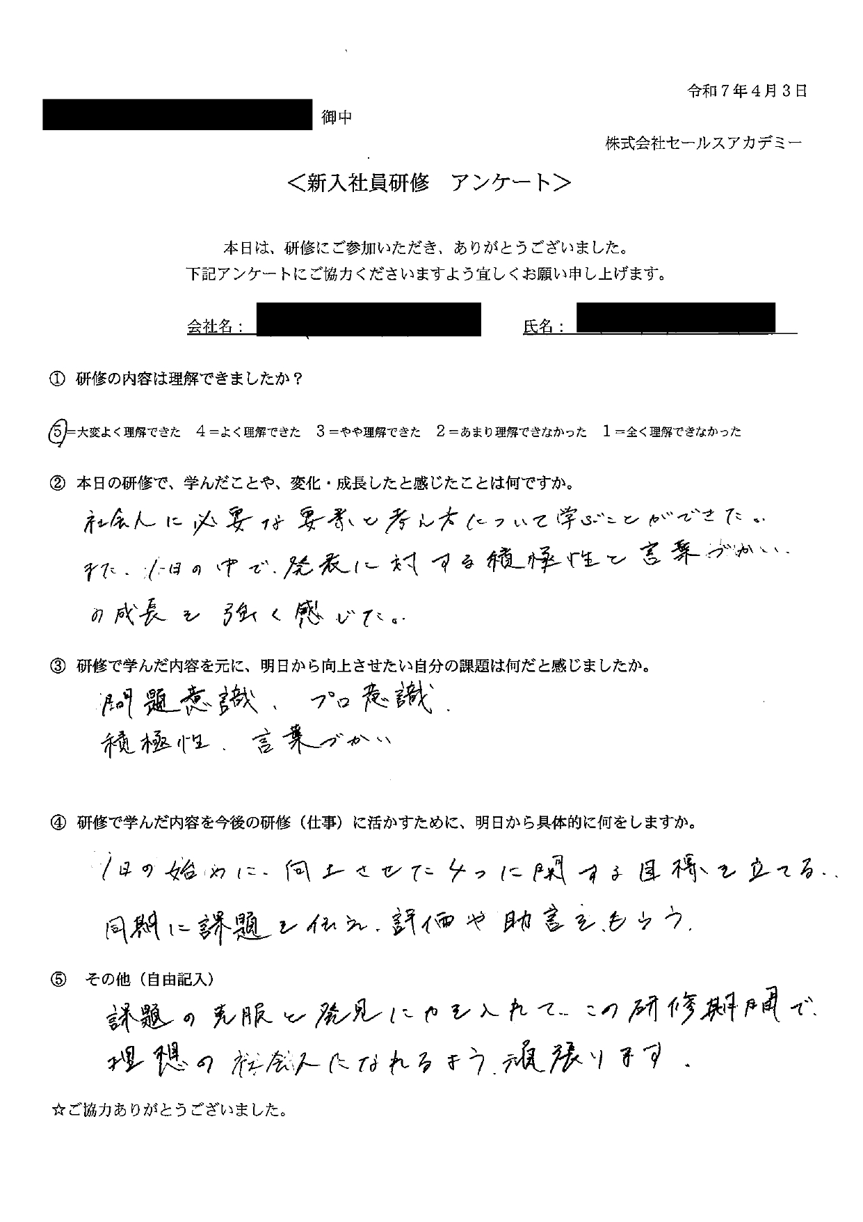 新入社員研修で学んだ内容を元に、明日から向上させたい自分の課題は何だと感じましたか。