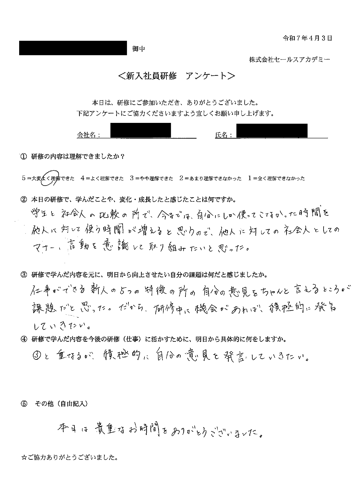新入社員研修で学んだ内容を元に、明日から向上させたい自分の課題は何だと感じましたか。