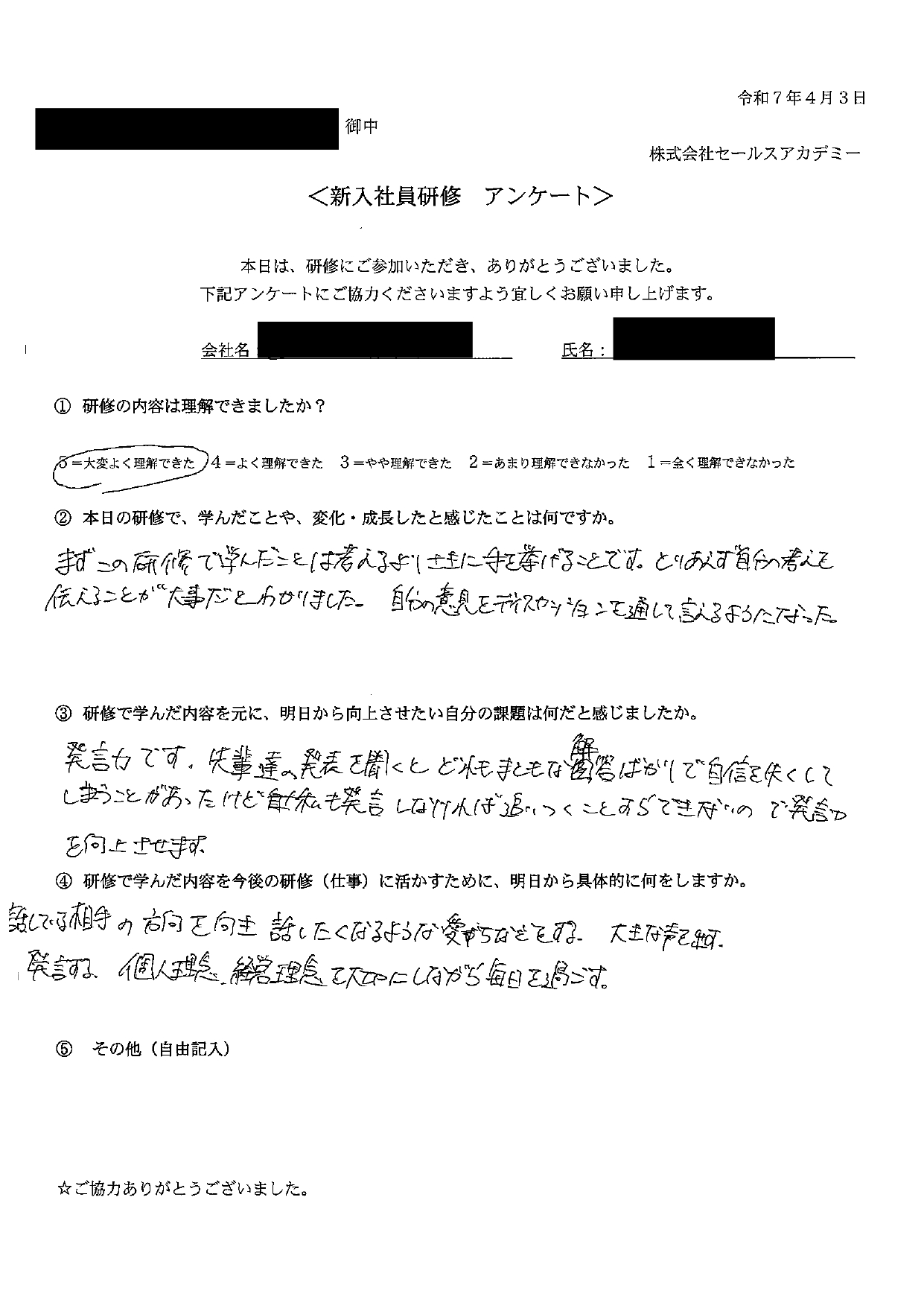 新入社員研修で学んだ内容を元に、明日から向上させたい自分の課題は何だと感じましたか。