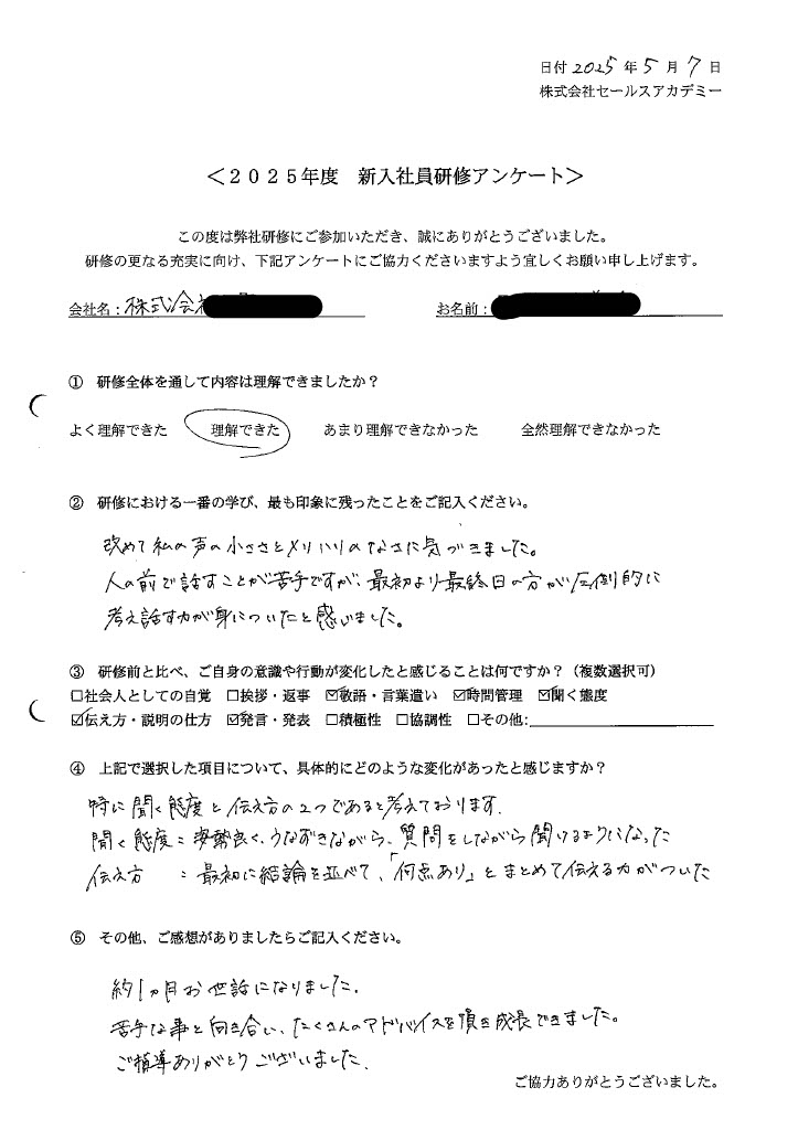新入社員研修における一番の学び、最も印象に残ったことをご記入ください。